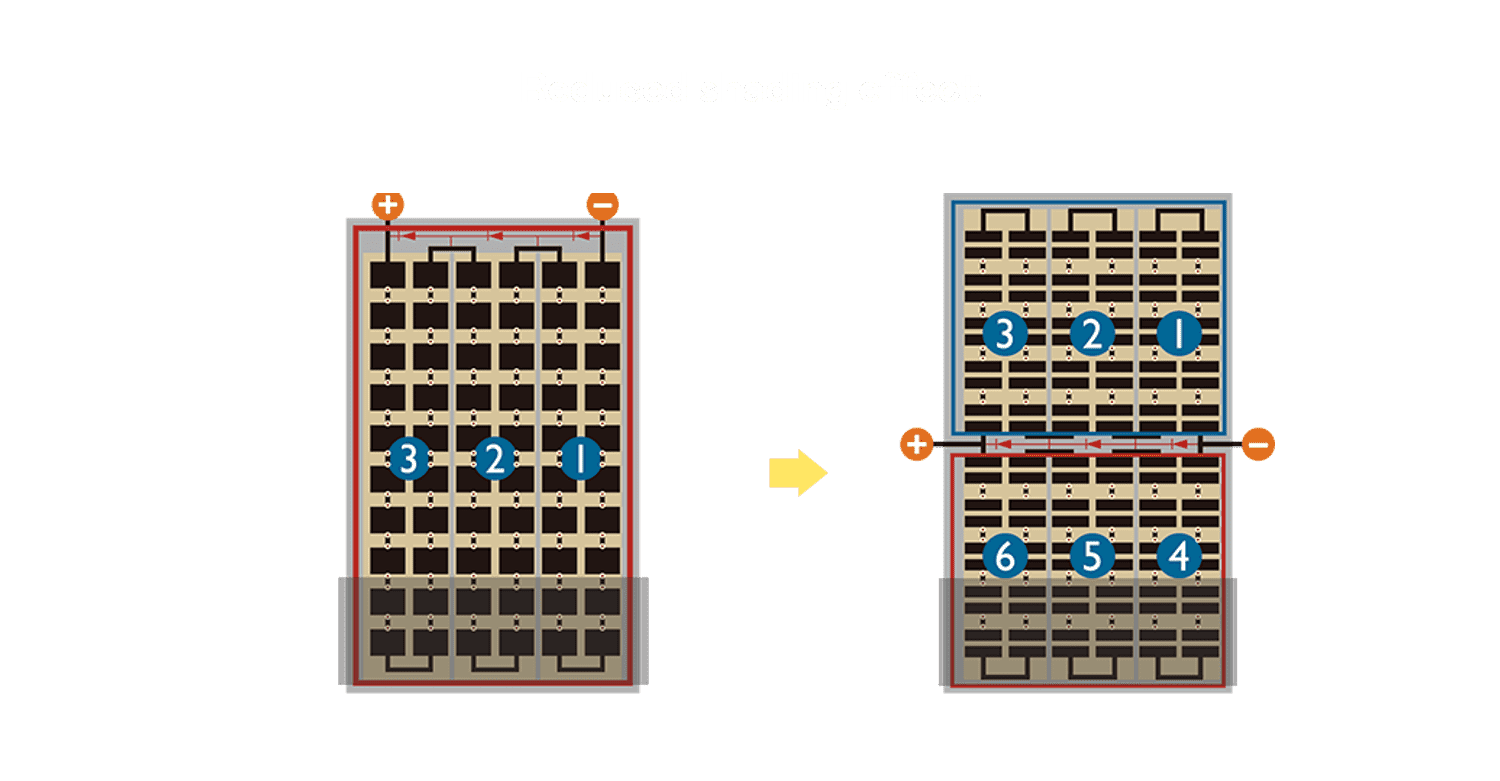 优化的太阳能电池结构设计,,,不仅提高电流收集效率,,,降低电池隐裂,,使太阳能模组长期维持稳定的输出效能,,提高营运效益。。